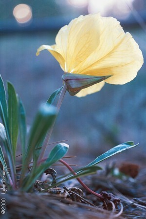 Primrose I'm told it's a primrose...? It was beside our picnic table, near the water faucet, at the base of an evergreen. One morning it was gloriously open, and so I began wriggling about, looking for the right view. This shot is from behind the flower, looking toward the rising sun. The beautiful blossom lasted just a single day.