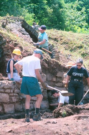 Jim looks for buried artifacts, as work progresses on the foundation wall and the ovens themselves.